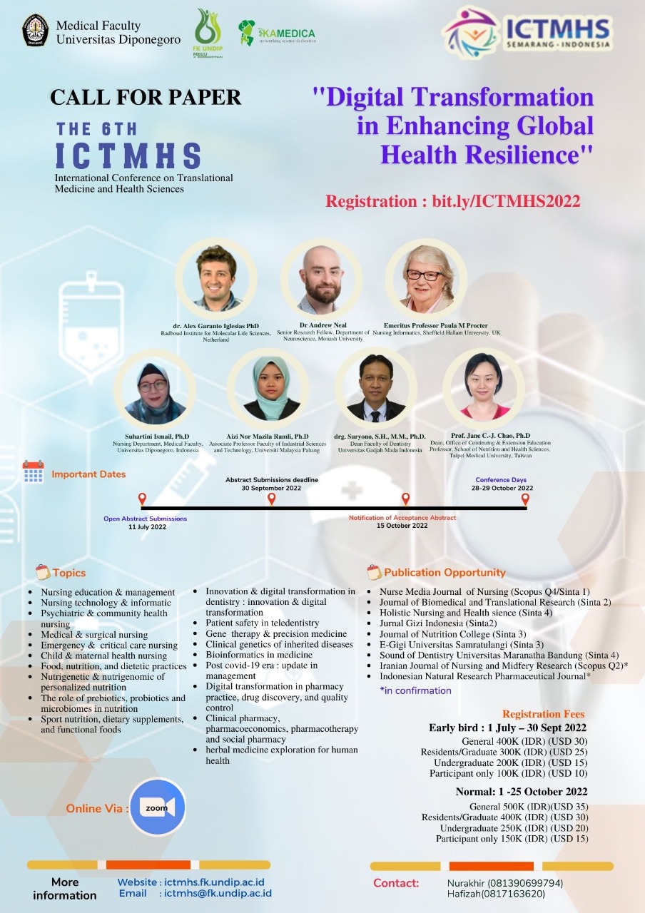 Semarang – Fakultas Kedokteran Universitas Diponegoro akan mengadakan konferensi internasional dengan tajuk: “The 6th International Conference on Translational Medicine and Health Sciences (ICTMHS)” secara online pada 28-29 Oktober 2022 dengan tema: Transformasi Digital dalam Meningkatkan Ketahanan Kesehatan Global.